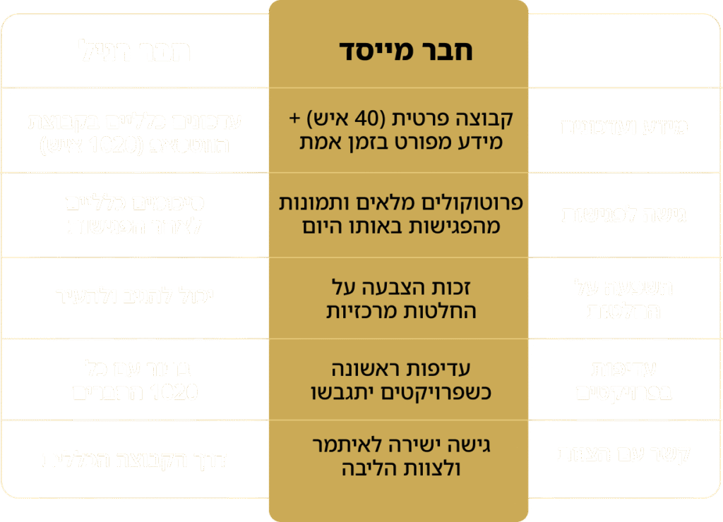 החברים המייסדים נכנסים לקבוצת ווטסאפ נפרדת עם: עדכונים בזמן אמת מהפגישות עם הרשויות, תמונות ומידע מהשטח לפני כולם, דוחות תקופתיים על התקדמות המיזם, גישה ישירה לאיתמר ולצוות הליבה